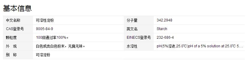 溶解度:可溶性淀粉不溶于冷水,溶解于沸水。水溶性淀粉為白色或黃白色粉末,在冷水中即可全溶。常溫下100ml水中邊加邊攪,至少可溶解60g該品。但其粘度較可溶性淀粉大。