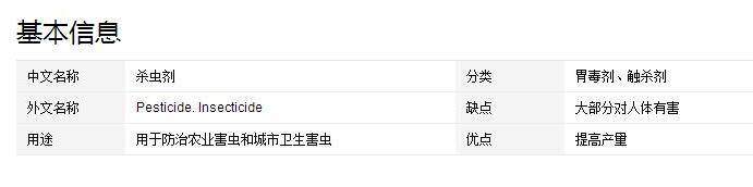 殺蟲劑(英文: Pesticide. Insecticide ), 主要用于防治農(nóng)業(yè)害蟲和城市衛(wèi)生害蟲的藥品.使用歷史長(zhǎng)遠(yuǎn)、用量大、品種多。在二十世紀(jì),農(nóng)業(yè)的迅速發(fā)展,殺蟲劑令農(nóng)業(yè)產(chǎn)量大升。但是,幾乎所有殺蟲劑都會(huì)嚴(yán)重地改變生態(tài)系統(tǒng),大部分對(duì)人體有害,其它的會(huì)被集中在食物鏈中。我們必須在農(nóng)業(yè)發(fā)展與環(huán)境及健康中取得平衡。