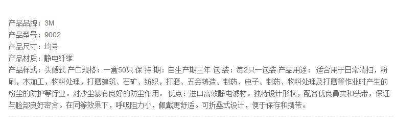 * 表示必填采購:3M 9002環(huán)保自吸過濾式防顆粒物口罩(頭帶式)50只