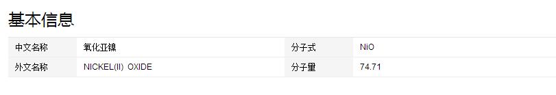 氧化亞鎳(NiO):外觀淺綠或深綠色粉末狀固體 氧化亞鎳性 狀: 本品比重為 6.6-6.8 ;松裝密度 為 0.5-1.5 ;振實密度為 1.5-2.0 ;費氏粒度為 2-5 ; 不溶于水,溶于硫酸、鹽酸、硝酸、氨水。