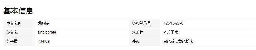 硼酸鋅,英文名稱是Flame Retardant ZB,CAS號(hào)是1332-07-6,分子式為HBO3Zn,分子量為125.2261,白色三斜晶體或無定形粉末,微溶于水,晶體不溶于鹽酸,無定形粉末則溶于鹽酸。硼酸鋅主要用作無機(jī)類添加劑、無毒阻燃劑,用于塑料、橡膠、紡織、涂料等行業(yè)。
