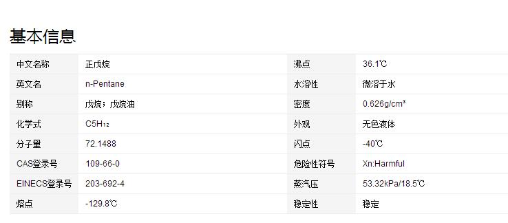 正戊烷(n-Pentane)化學(xué)式C5H12,烷烴中的第五個成員。正戊烷有2種同分異構(gòu)體:異戊烷(沸點(diǎn)28°C)和新戊烷(沸點(diǎn)10°C),"戊烷"一詞通常指正戊烷,即其直鏈異構(gòu)體。