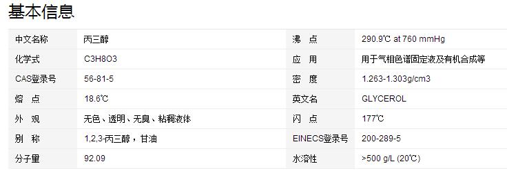 丙三醇是無色味甜澄明黏稠液體。無臭。有暖甜味。俗稱甘油,能從空氣中吸收潮氣,也能吸收硫化氫、氰化氫和二氧化硫。難溶于苯、氯仿、四氯化碳、二硫化碳、石油醚和油類。相對密度1.26362。熔點17.8℃。沸點290.0℃(分解)。折光率1.4746。閃點(開杯)176℃。急性毒性:LD50:31500 mg/kg(大鼠經(jīng)口)。 丙三醇是甘油三酯分子的骨架成分。當(dāng)人體攝入食用脂肪時,其中的甘油三酯經(jīng)過體內(nèi)代謝分解,形成甘油并儲存在脂肪細(xì)胞中。因此,甘油三酯代謝的最終產(chǎn)物便是甘油和脂肪酸。可用作溶劑,潤滑劑,藥劑和甜味劑。