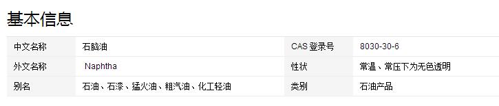 石腦油(naphtha)是石油產(chǎn)品之一,又叫化工輕油,是以原油或其他原料加工生產(chǎn)的用于化工原料的輕質(zhì)油,主要用作重整和化工原料。因用途不同有各種不同的餾程,中國規(guī)定餾程為初餾點至220℃左右。作為生產(chǎn)芳烴的重整原料時,采用70℃~145℃餾分,稱輕石腦油;當(dāng)以生產(chǎn)高辛烷值汽油為目的時,采用70℃~180℃餾分,稱重石腦油;用作溶劑時,則稱溶劑石腦油;來自煤焦油的芳香族溶劑也稱重石腦油或溶劑石腦油。