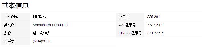 研究表明過(guò)硫酸銨作為氧化劑和漂白劑,被廣泛地用于蓄電池工業(yè);它還用作聚合的引發(fā)劑、纖維工業(yè)的脫漿劑; 并可用作金屬及半導(dǎo)體材料表面處理劑、印刷線路的刻蝕劑; 還廣泛用于石油開(kāi)采的油層壓裂, 面粉和淀粉加工業(yè)、油脂工業(yè), 在照相工業(yè)上用來(lái)除去海波。