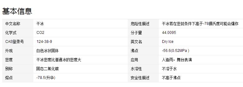 干冰是固態(tài)的二氧化碳,在6250.5498千帕壓力下,把二氧化碳冷凝成無色的液體,再在低壓下迅速蒸發(fā)而得到。二氧化碳常態(tài)下是一種無色無味的氣體,自然存在于空氣中,雖然二氧化碳在空氣中的含量相對(duì)而言很小(體積比大約占0.03%)但它卻是我們所認(rèn)識(shí)到的最重要的氣體之一。干冰極易揮發(fā),升華為無毒、無味的,比固體體積大600-800倍的氣體二氧化碳,所以干冰不能儲(chǔ)存于完全密封性體積的容器中,如塑料瓶,干冰與液體混裝很容易爆炸。