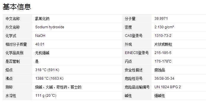 氫氧化鈉,化學(xué)式為NaOH,俗稱燒堿、火堿、苛性鈉,為一種具有強(qiáng)腐蝕性的強(qiáng)堿,一般為片狀或顆粒形態(tài),易溶于水(溶于水時(shí)放熱)并形成堿性溶液,另有潮解性,易吸取空氣中的水蒸氣(潮解)和二氧化碳(變質(zhì))。